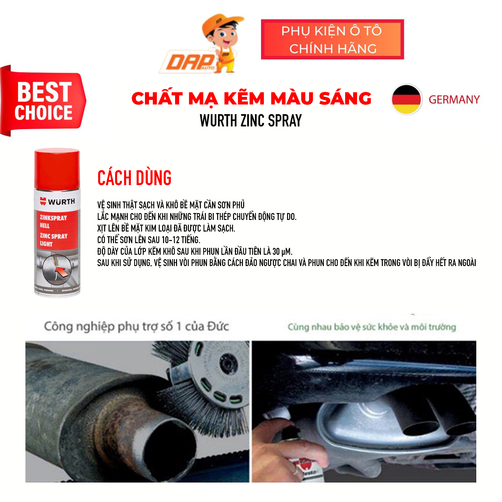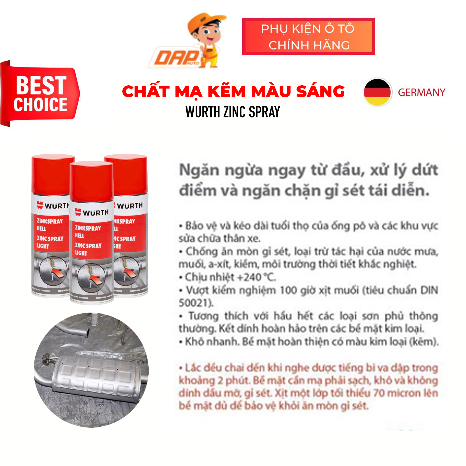 Chất mạ kẽm màu sáng Wurth Zinc Spray là dạng sơn lót chống rỉ chịu nhiệt độ cao tới 240°C với thành phần 96.5% kẽm nguyên chất. Bảo vệ chống rỉ, kháng muối, chống ăn mòn và khả năng bám dính tuyệt vời trên bề mặt kim loại trần.