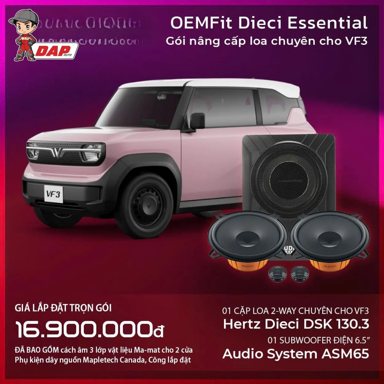 Gói độ âm thanh VF3 – OEM Fit Dieci Essential là giải pháp nâng cấp âm thanh toàn diện được thiết kế riêng cho VinFast VF3. Với sự kết hợp giữa cặp loa 2-way Hertz Dieci DSK 130.3 và Subwoofer Audio System ASM65, gói độ mang đến dải âm chi tiết, trầm ấm mà vẫn giữ nguyên bản hệ thống điện của xe. Giá trọn gói đã bao gồm phụ kiện cao cấp và cách âm cửa 3 lớp.