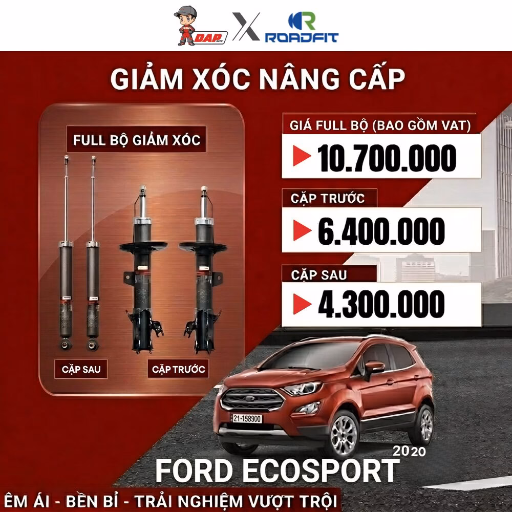 Ford EcoSport 2020 luôn được các bác tài yêu thích nhờ thiết kế nhỏ gọn, gầm cao tiện lợi cho việc di chuyển trong phố. Tuy nhiên, hệ thống treo nguyên bản của dòng xe này thường bộc lộ nhược điểm là khá cứng khi đi một mình và dễ gây ra hiện tượng xóc nảy “hỗn” khi băng qua các gờ giảm tốc. Điều này không chỉ gây khó chịu cho người lái mà còn khiến hành khách dễ mệt mỏi. Để giải quyết triệt để vấn đề này, DAP Auto mang đến giải pháp thay thế bằng dòng phuộc giảm xóc Roadfit – sản phẩm hàng đầu đến từ xứ sở Kim Chi.